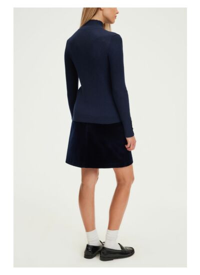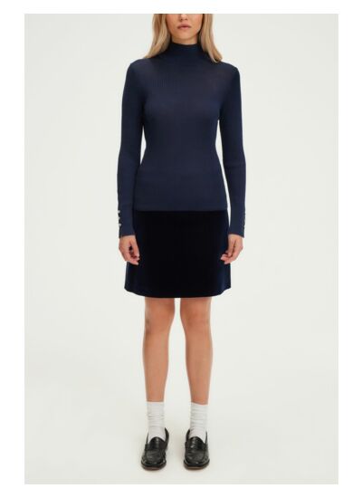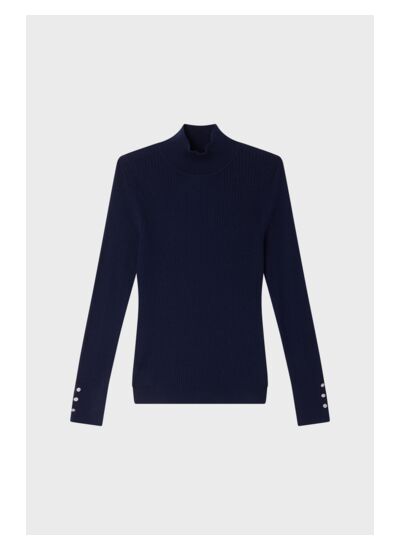 Pull fin à côtes avec un col montant et des boutons en strass aux poignets. Laine mélangée. A porter en twin-set avec le gilet assorti.