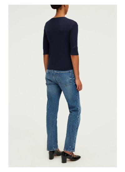 Ce pull est-il adapté aux saisons intermédiaires ? Oui, grâce à sa laine fine et sa matière stretch, ce pull à manches courtes offre chaleur légère et confort, idéal pour le printemps et l’automne. Quelle coupe privilégier pour ce modèle ? La forme droite et la longueur standard conviennent à toutes les morphologies, garantissant une silhouette élégante et moderne sans serrer. Comment entretenir ce pull en laine mélangée ? Il est recommandé de laver à la main ou en cycle délicat à basse température pour préserver la qualité des fibres et la tenue des côtes. Ce modèle taille-t-il normalement ? Oui, la coupe est fidèle aux tailles habituelles ; la mannequin mesure 180 cm et porte une taille 1, ce qui correspond à une taille standard. Ce pull peut-il se porter en layering ? Absolument, sa finesse et son col rond facilitent le superposition avec chemises ou vestes pour un look polyvalent et raffiné.