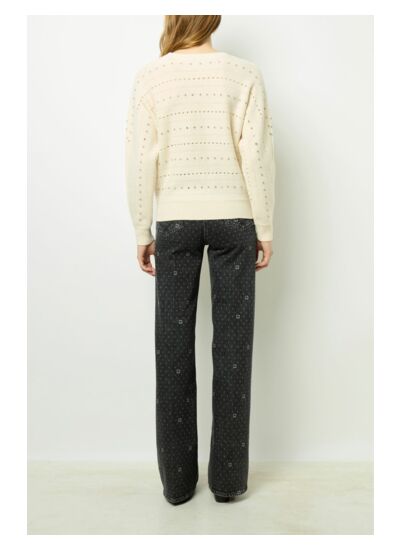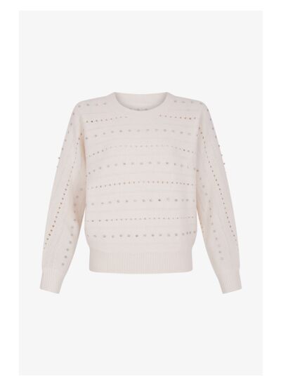 Pull à jeux de maille ajourés et strass. 100% laine mérinos.