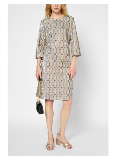 Robe droite mi-longue à sequins pastel dans un esprit seventies chic.