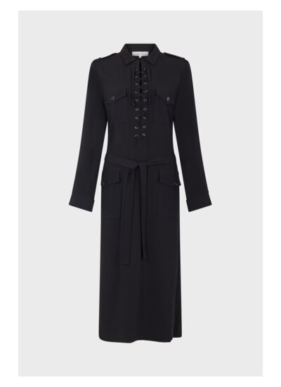 Robe longue noire à l'encolure lacée dans une matière fluide. A porter droite ou avec la ceinture pour une allure sophistiquée.
