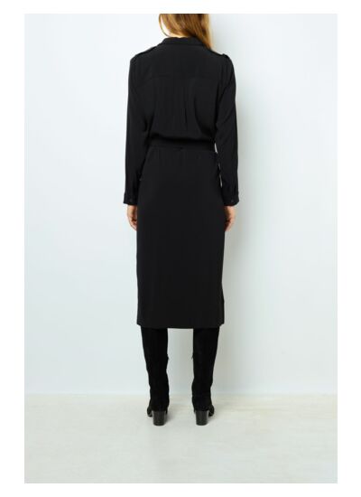 La robe SABRYNA dispose-t-elle de détails pratiques ? Oui, elle est équipée de poches à rabat avec bouton à la poitrine et à la taille, ainsi que de poignets fermés par un bouton, alliant fonctionnalité et élégance.
