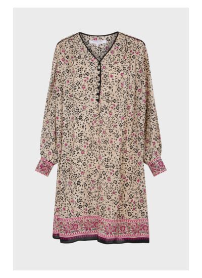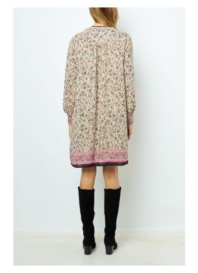 Robe courte et droite à manches longues et col V avec un imprimé floral. Matière fluide.
