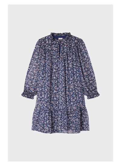Robe courte en mousseline avec un imprimé floral et une pointe de lurex.