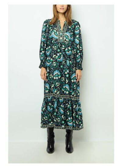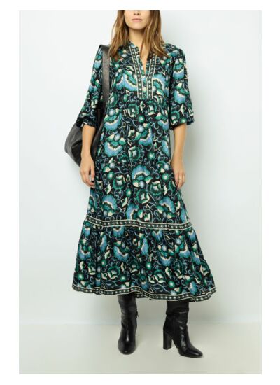 Cette robe midi Gerard Darel taille-t-elle normalement ? La robe SANDA suit une coupe standard avec une forme légèrement évasée en bas, offrant un confort adapté à la plupart des morphologies. Pour un ajustement parfait, référez-vous au guide des tailles de la marque. De quelle matière est composée la robe SANDA ? La robe est conçue dans une matière fluide et douce, associée à un fond jacquard qui met en valeur l’imprimé végétal, garantissant à la fois élégance et confort au porter. Comment porter cette robe pour un look réussi ? Grâce à sa longueur midi, son col rond esprit tunisien et ses manches longues avec poignets élastiqués smockés, cette robe s’adapte aussi bien à une tenue de journée chic qu’à une soirée décontractée, à associer avec des bottines ou des escarpins selon l’occasion. La robe SANDA nécessite-t-elle un entretien particulier ? Pour préserver la qualité du jacquard et la douceur de la matière, il est recommandé de suivre les instructions d’entretien indiquées sur l’étiquette, généralement un lavage délicat ou nettoyage à sec. Quels sont les détails qui rendent cette robe unique ? La jupe à étages volantés, les épaules légèrement froncées et les plis en haut du dos apportent une touche de sophistication et de mouvement, soulignant la féminité tout en assurant une silhouette élégante.