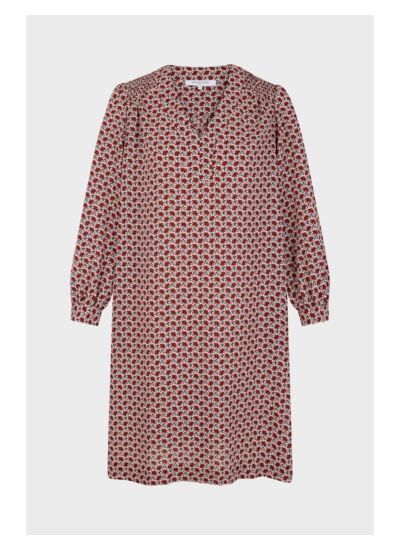 Quels détails distinguent cette robe dans une collection ? Son col en V, les manches 7/8 avec boutons ronds aux poignets, ainsi que les petits plis et smocks aux épaules créent un jeu de textures subtil qui sublime l’imprimé pâquerettes avec élégance.