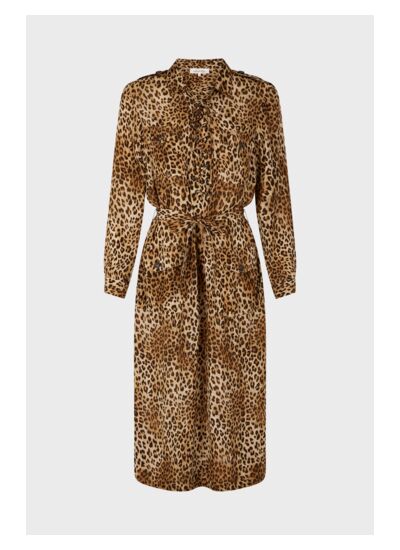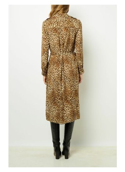 Robe longue léopard à l'encolure lacée dans une matière fluide. A porter droite ou à ceinturer pour une allure sophistiquée.