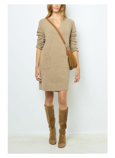 Robe courte et droite en laine avec une touche de cachemire. Col tunisien et jeux de côtes pour un esprit casual chic.