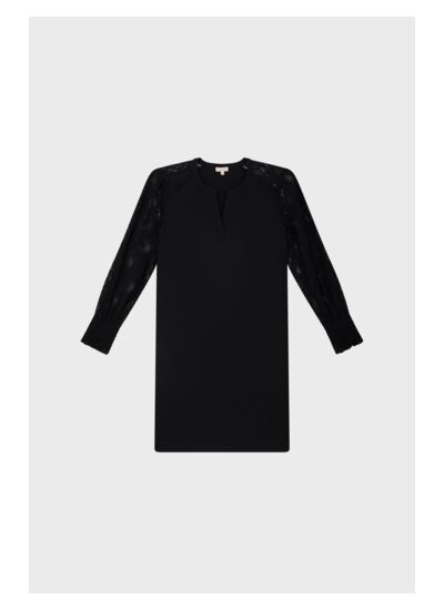 De quel tissu est composée cette robe ? Elle est confectionnée en crêpe uni noir, un tissu léger et fluide, associé à des manches en dentelle pour une touche sophistiquée et féminine.