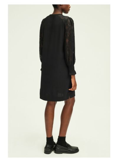 Robe en crêpe noir avec des manches en dentelle pour apporter une sophistication.