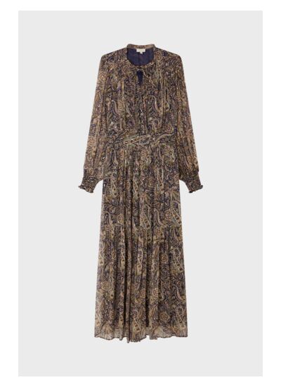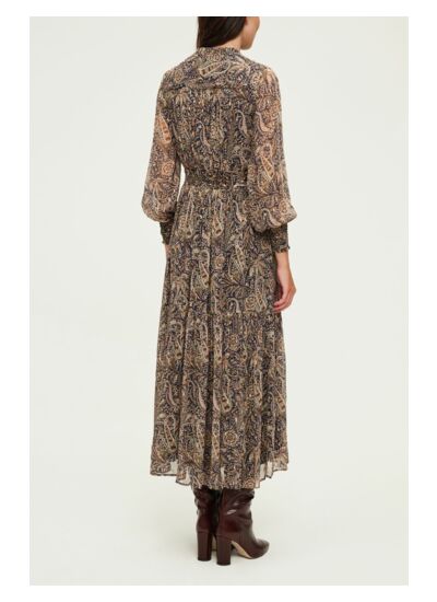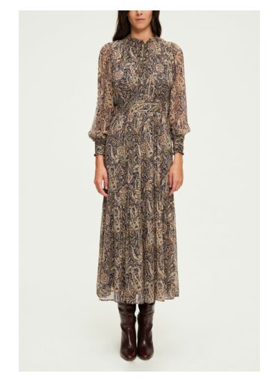 Robe longue avec un imprimé cachemire orné de lurex. A porter avec des bottes dans un esprit seventies chic.