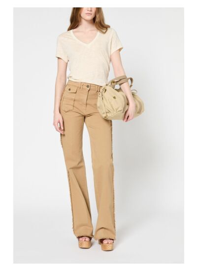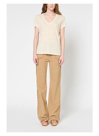 T-shirt en 100% lin au col V orné d'une broderie et d'un fil de lurex doré.
