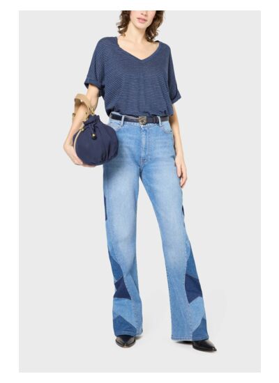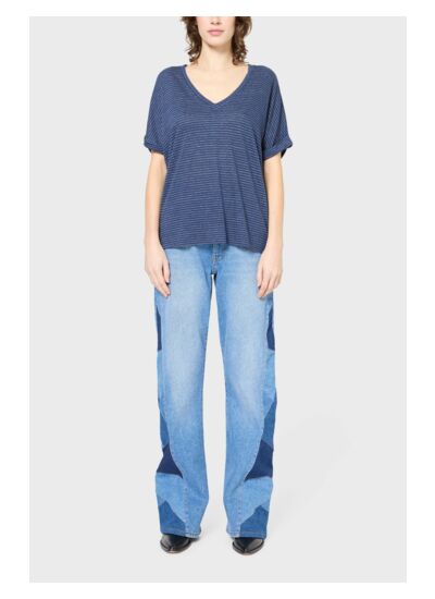 Le col en V met en valeur le décolleté, tandis que les manches courtes à revers cousu apportent une note de fraîcheur. Les petites fentes latérales ajoutent une touche de dynamisme à votre silhouette. Ce t-shirt se marie parfaitement avec un jean décontracté pour une sortie entre amis ou avec une jupe fluide pour un look plus habillé lors d'une soirée.