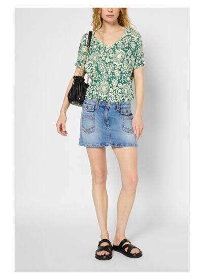 T-shirt à col V en lin et coton avec un imprimé d'inspiration cachemire.