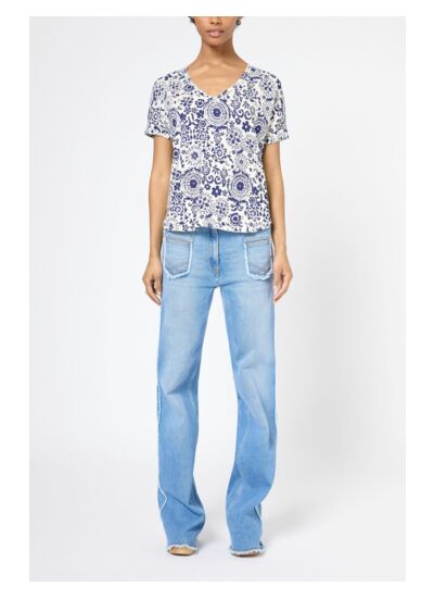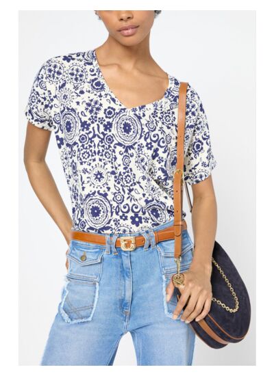 T-shirt à col V en lin et coton avec un imprimé d'inspiration cachemire.