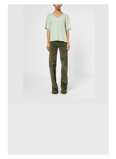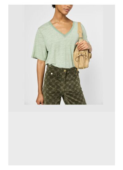 T-shirt ample à col V en 100% lin. Coloris vert tendre à porter avec des teintes claires comme foncées.