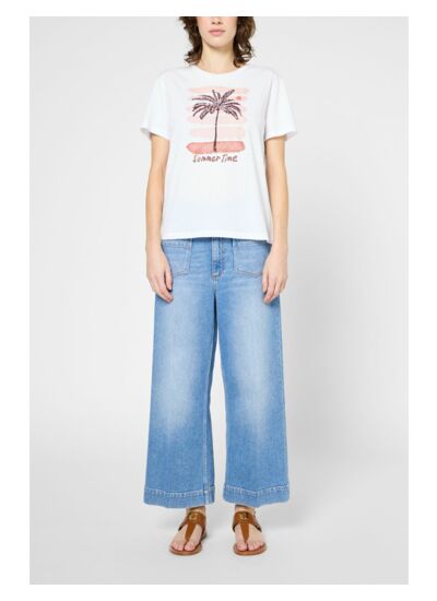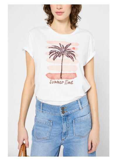 T-shirt à col rond en 100% coton, avec un palmier brodé et une inscription summertime.