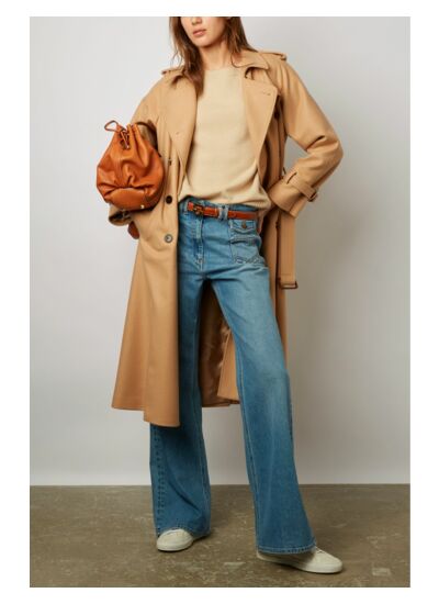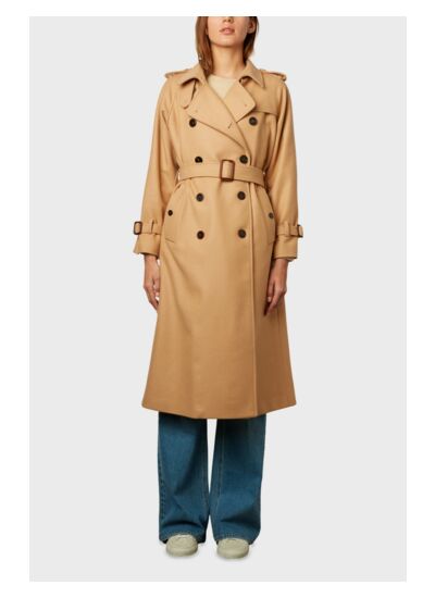 - Finitions trench : pattes d'épaule, fermeture par agrafe au col, bavolet au dos, poignets ceinturés, ceinture à boucle