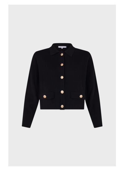Quels sont les détails qui rendent cette veste unique ? La veste JULIE se distingue par ses boutons ronds dorés gravés, son col polo élégant, ainsi que ses poches à rabat ornées de boutons dorés, alliant fonctionnalité et style classique chic.