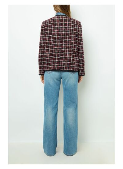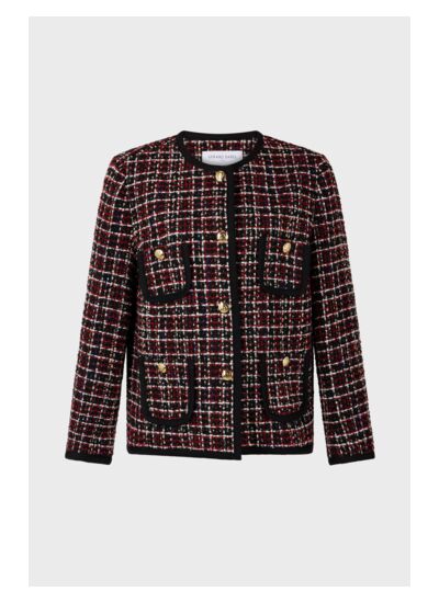 Veste en tweed rouge et noir discrètement tissé de lurex. Finitions avec un galon noir pour apporter du contraste.