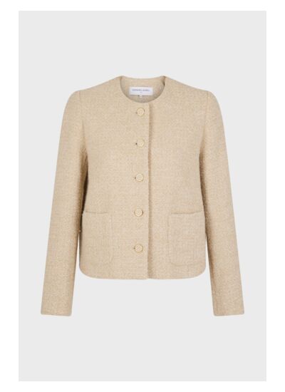 Cette veste est-elle facile à assortir avec d’autres pièces ? Oui, son motif tweed et sa couleur dorée subtile permettent de la porter avec des pantalons, jupes ou robes unies, pour un look harmonieux et chic en toute occasion.