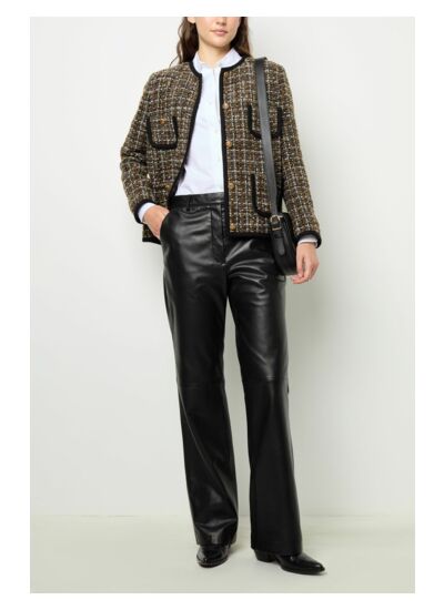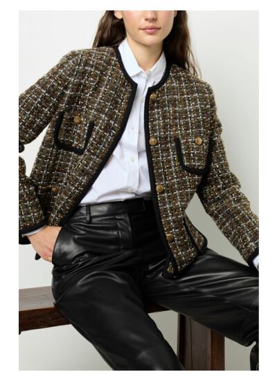Veste en tweed orné de lurex. Finition avec un galon noir pour apporter du contraste et structurer le modèle.