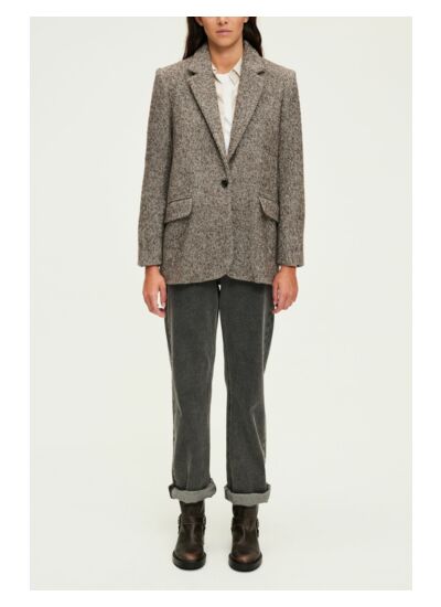 Le blazer MAZARINE convient-il à un style casual ? Oui, son mélange de laine et son motif à rayures obliques lui confèrent un esprit casual tout en restant élégant, idéal pour un look décontracté mais soigné. Quelle coupe propose ce blazer ? Il présente une forme droite et large avec une longueur couvrant les hanches, offrant confort et aisance sans sacrifier la silhouette. Comment se ferme la veste ? Le blazer se ferme par un bouton rond unique, assorti aux poignets également fermés par un bouton rond, pour une finition soignée et cohérente. Quelles sont les caractéristiques pratiques de ce blazer ? Il dispose de poches passepoilées à rabat pour un rangement discret et d’une fente d’aisance au dos qui facilite les mouvements. Quelle taille choisir pour une personne de grande taille ? La mannequin mesure 180 cm et porte une taille 38, ce qui peut servir de référence pour choisir la taille adaptée selon votre morphologie.