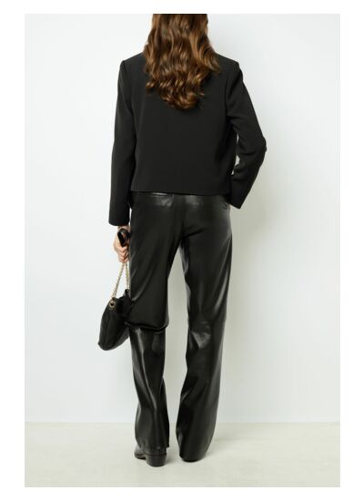 Cette veste courte en microfibre noir est l'alliée parfaite pour un look chic et moderne. Avec sa forme droite et son design épuré, elle s'adapte à toutes vos tenues, que ce soit pour une journée au bureau ou une soirée entre amis. Les poches plates ornées de chaînettes dorées ajoutent une touche d'élégance et de sophistication, tout en étant pratiques pour y glisser vos essentiels.