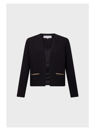 Veste courte en microfibre noir aux poches ornées de chaînes dorées.