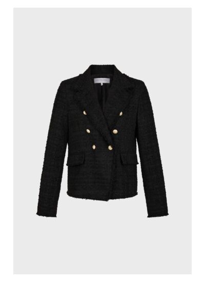 Blazer à boutonnage croisé en tweed noir et boutons gravés. Style chic et classique.