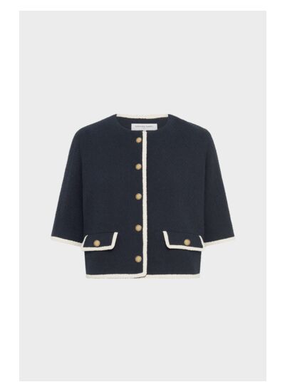 Cette veste RELINA est-elle adaptée pour un look professionnel ? Oui, sa coupe droite et son tissu tweed bicolore bleu marine et blanc s’inscrivent parfaitement dans un style tailleur élégant, idéal pour un environnement professionnel ou des occasions formelles. Comment entretenir la veste RELINA pour préserver son aspect tweed ? Il est recommandé de suivre les instructions de lavage indiquées sur l’étiquette, privilégier un nettoyage à sec pour conserver la qualité du coton mélangé et éviter que les boutons argentés gravés ne s’abîment. La veste RELINA est-elle facile à associer avec d’autres pièces ? Oui, sa couleur bicolore sobre et sa coupe courte sans col s’adaptent aisément à des tenues variées, notamment avec la jupe assortie pour un ensemble coordonné ou avec un pantalon pour un look plus décontracté. Quels sont les détails qui font la différence sur cette veste ? Les boutons argentés gravés, les poches à rabat avec bouton et les manches mi-longues apportent une touche raffinée et fonctionnelle, renforçant le caractère chic et contemporain de la veste RELINA. Cette veste convient-elle à toutes les saisons ? Elle est idéale pour les saisons intermédiaires grâce à son tissu en coton mélangé, offrant confort et légèreté tout en maintenant une allure structurée et élégante.