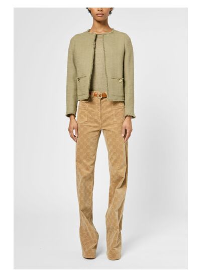 L'incontournable veste en tweed est revisitée en kaki pour un look tendance. Poches ornées de boutons dorés gravés.