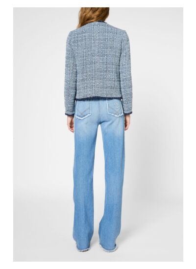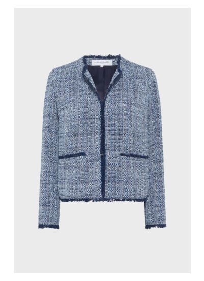 Veste en tweed à franges et lurex dans un esprit classique revisité.