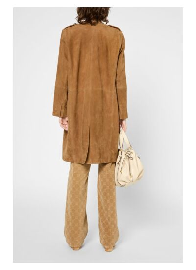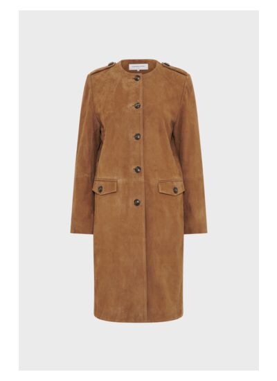 Veste longue sans col en cuir velours, matière noble par excellence. Pattes aux épaules pour un esprit classique revisité.
