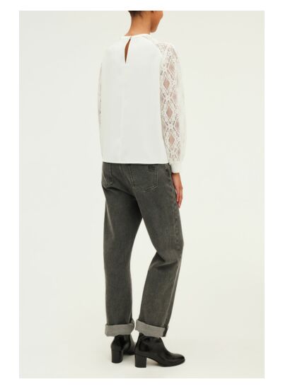 Top en crêpe et manches en dentelle pour une silhouette romantique chic.