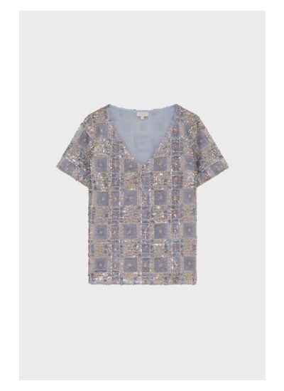 Top à col V orné de sequins bleus, nacrés et argentés et formant des motifs géométriques. Esprit estival et festif.