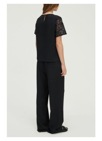 Top bleu marine au col et aux manches en dentelle, confectionné dans une matière à l'aspect légèrement texturé et brillant.