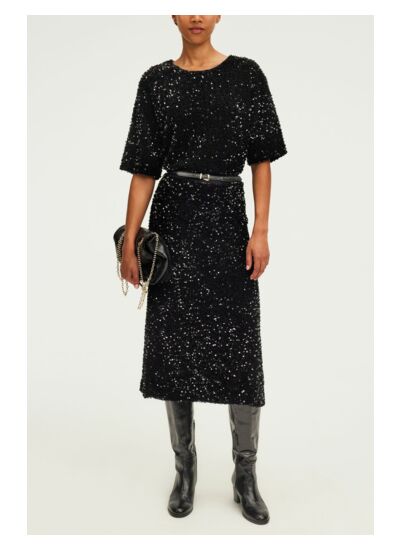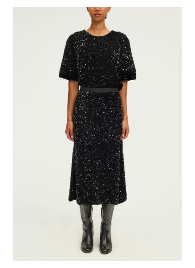 Jupe mi-longue brodée de sequins noirs pour un look sophistiqué.