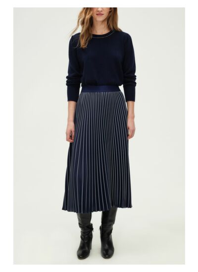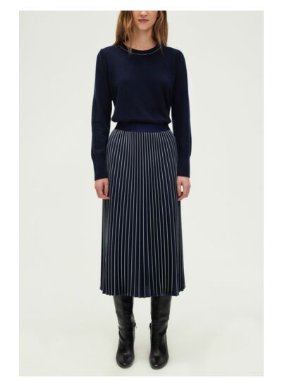 Jupe plissée bicolore dans un esprit graphique. Incrustation de lurex dans les bandes blanches pour un subtil effet paillettes.