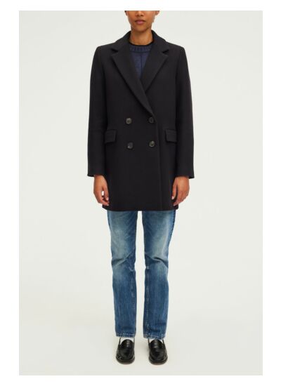 Manteau droit à boutonnage croisé en laine vierge mélangée. Longueur idéale pour porter avec une jupe.