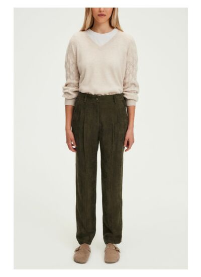 Pantalon en velours fluide à côtes à l'aspect légèrement brillant. Kaki profond.