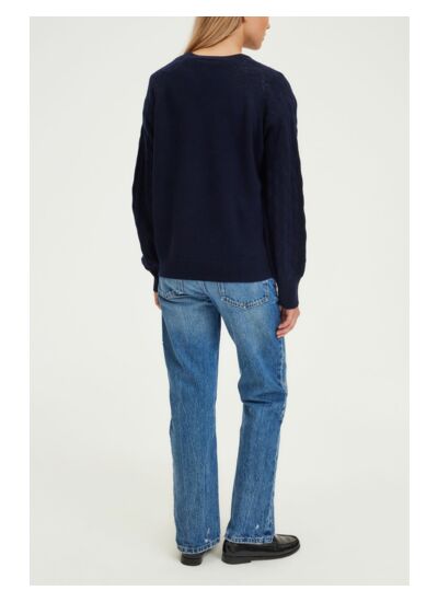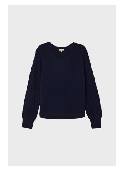 Pull V en 100% laine. Manches avec des losanges ajourés.