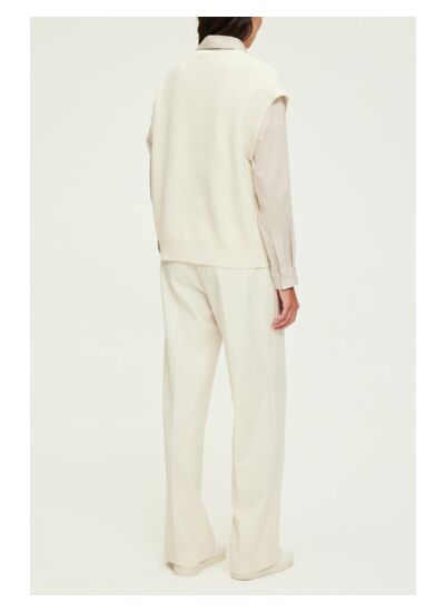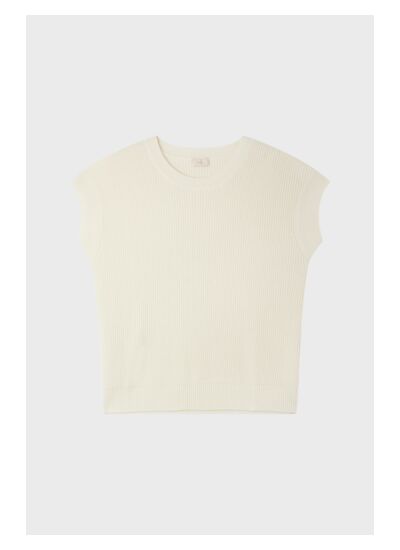 Optez pour une pièce intemporelle avec ce pull sans manches en laine, parfait pour les superpositions élégantes. Sa forme droite et large offre un confort inégalé tout en mettant en valeur votre silhouette. La texture côtelée en laine unie apporte une touche de sophistication, tandis que l'échancrure généreuse sous les bras assure une liberté de mouvement idéale pour vos journées actives.