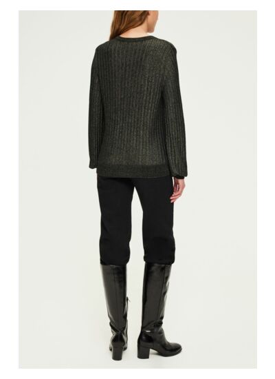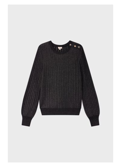Pull fin à côtes et lurex en laine mélangée. Epaule gauche ornée de boutons dorés.