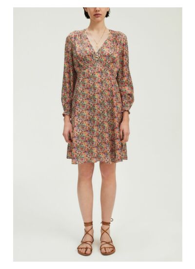 Robe courte et cintrée à fleurs multicolores et au col orné d'une fine dentelle pour une silhouette très féminine. Matière douce et légèrement satinée.