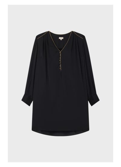 Élevez votre style avec cette robe courte et large, conçue dans un tissu gaufré au fini légèrement satiné qui capte la lumière avec élégance. Son col en V flatteur et ses manches longues ajoutent une touche de sophistication, tandis que les poignets ornés de smocks élastiqués offrent un confort optimal. Les finitions dorées, y compris le piping délicat et les faux boutons dorés, rehaussent le design, apportant une note chic à votre garde-robe.