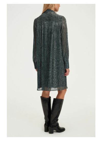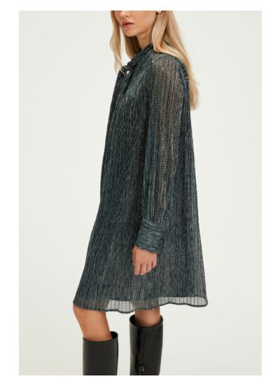 Éveillez votre sens du style avec cette robe courte en lurex, parfaite pour les occasions festives. Sa forme droite et large offre un confort inégalé tout en mettant en valeur votre silhouette. Le motif scintillant en lurex attire tous les regards, tandis que le col lavallière ajoute une touche d'élégance intemporelle. Les manches longues, ornées de bas smockés et de boutons raffinés, apportent une note de sophistication à votre tenue.