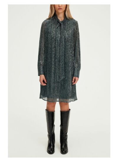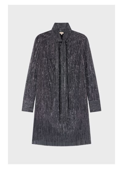 Robe courte en lurex et col lavallière dans un esprit festif.