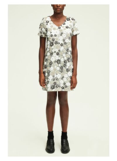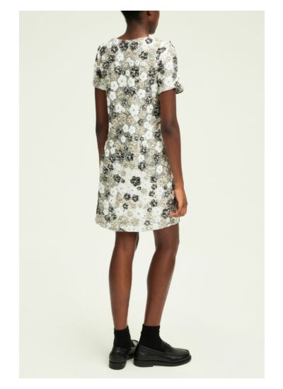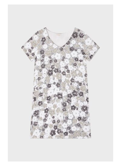 Éblouissez lors de vos soirées avec cette robe courte à sequins argentés et blancs, parfaite pour un look festif et glamour. Sa forme droite légèrement évasée flatte toutes les silhouettes, tandis que le motif floral en sequins ajoute une touche d'élégance et de sophistication. Le col en V et les manches courtes apportent une allure féminine et moderne, idéale pour danser toute la nuit.