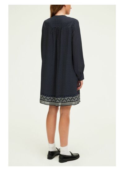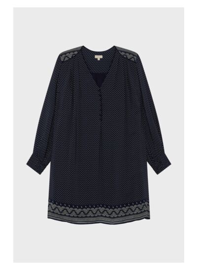 Robe courte et large avec un imprimé écru sur fond marine. Matière fluide au toucher soyeux. A porter avec une ceinture pour une silhouette plus sophistiquée.